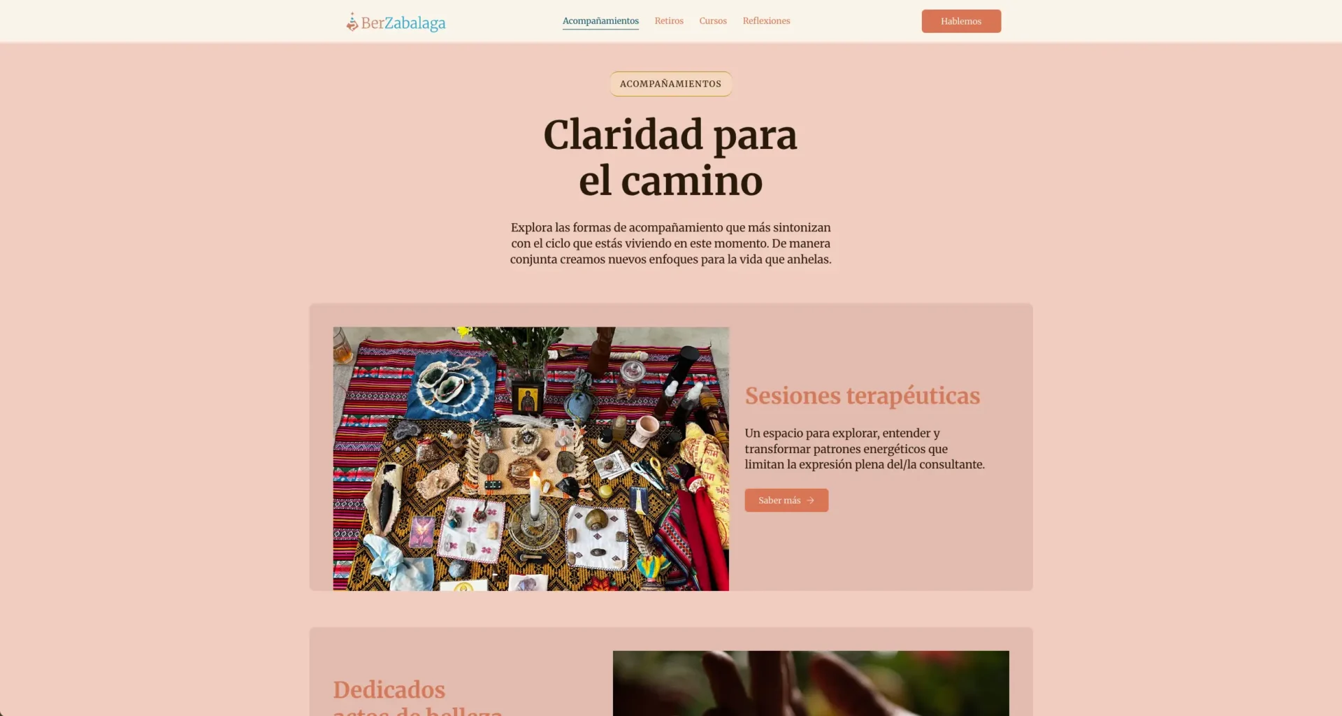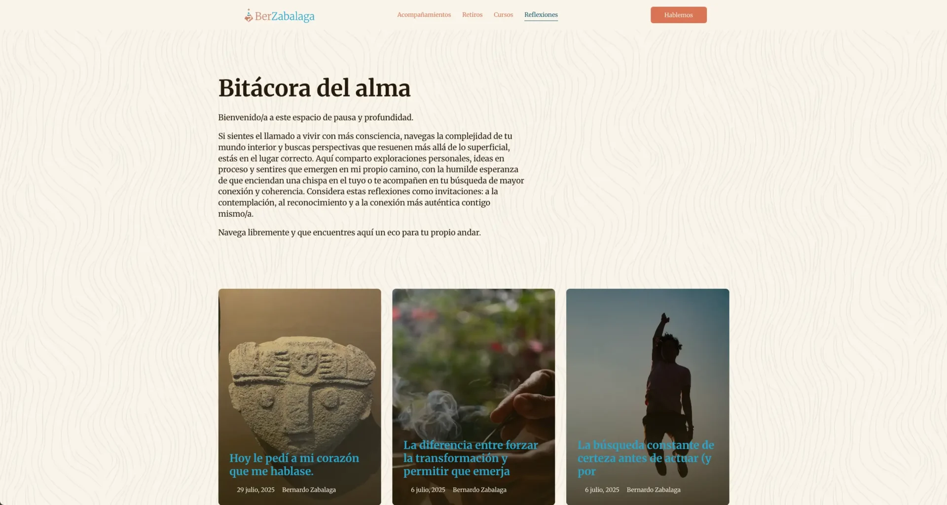 Técnicamente, construimos un sitio organizado en tres áreas principales: sus servicios individuales (que Bernardo llama "acompañamientos"), sus cursos, y sus retiros. Cada uno con su propio espacio, su propio diseño, y su propia lógica.